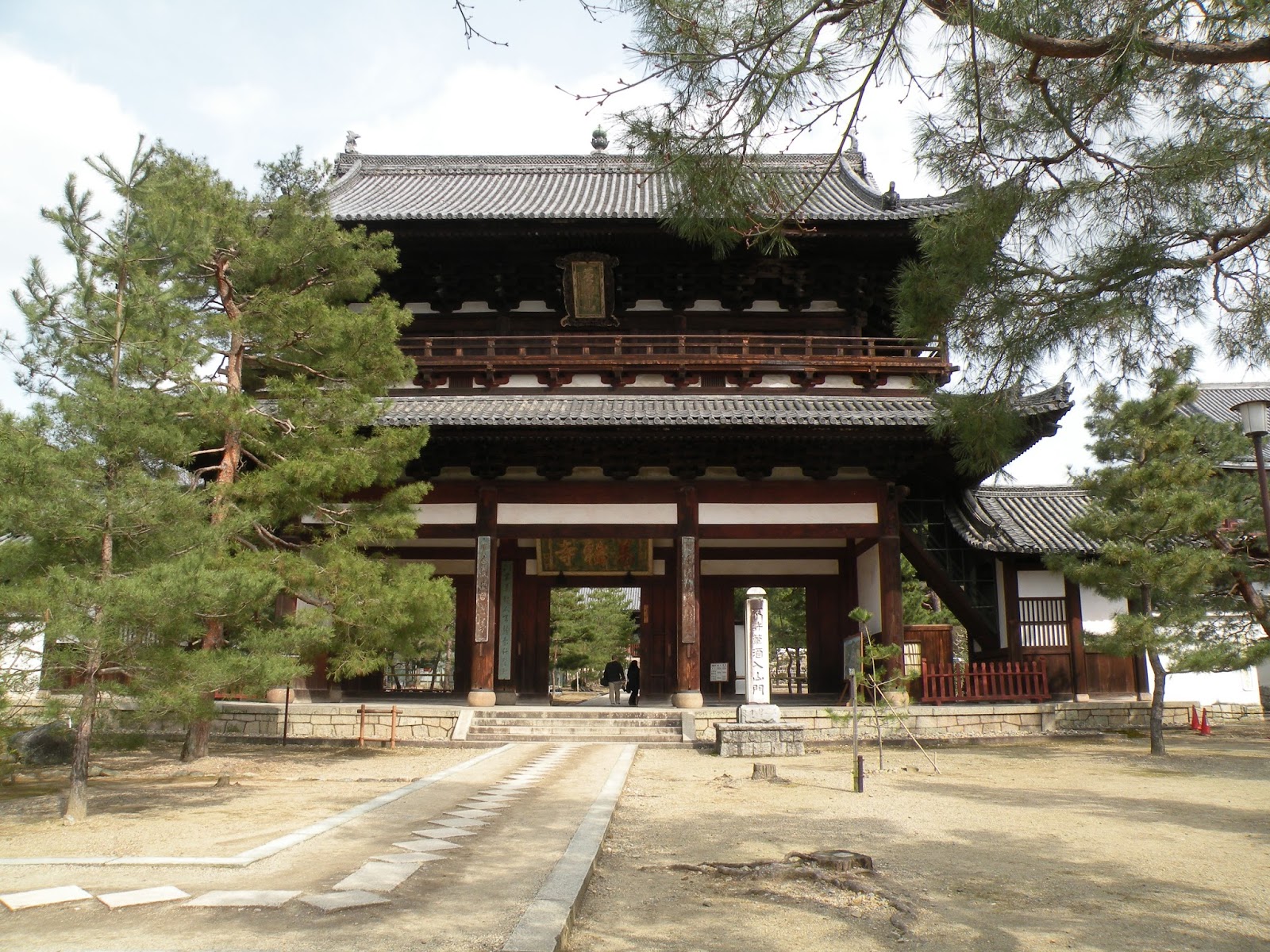 三間三戸二重門で門の正面柱間が3間で、3間すべてが通路になっている。中国様式