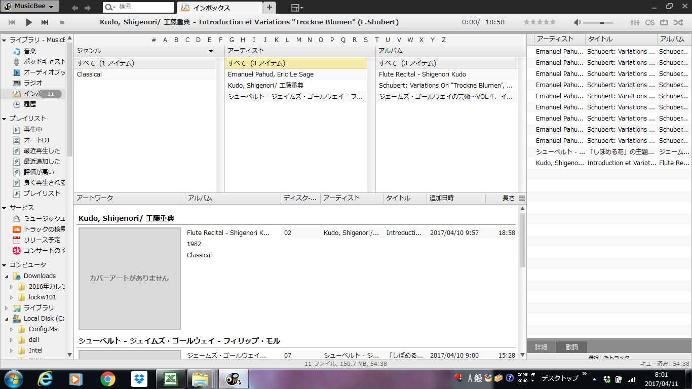 | コメント | ウオルフガング・シュルツはランパル、ニコレの跡を継ぐフルートソリストでアルバムがあることを期待したが「牧神の午後への前奏曲」のみで、この曲は無かった、日本人の工藤盤を含めて、3枚手許に有り、残りはプロの推す、演奏はいくつかYoutubeで、検索できた。知らない演奏家も多いのはこの菅楽器特有でしょうか?季節のいい、今にうってつけの曲だろうか歌曲集の「美しい水車小屋の娘」の18曲目の主題とおなじである。 | |
